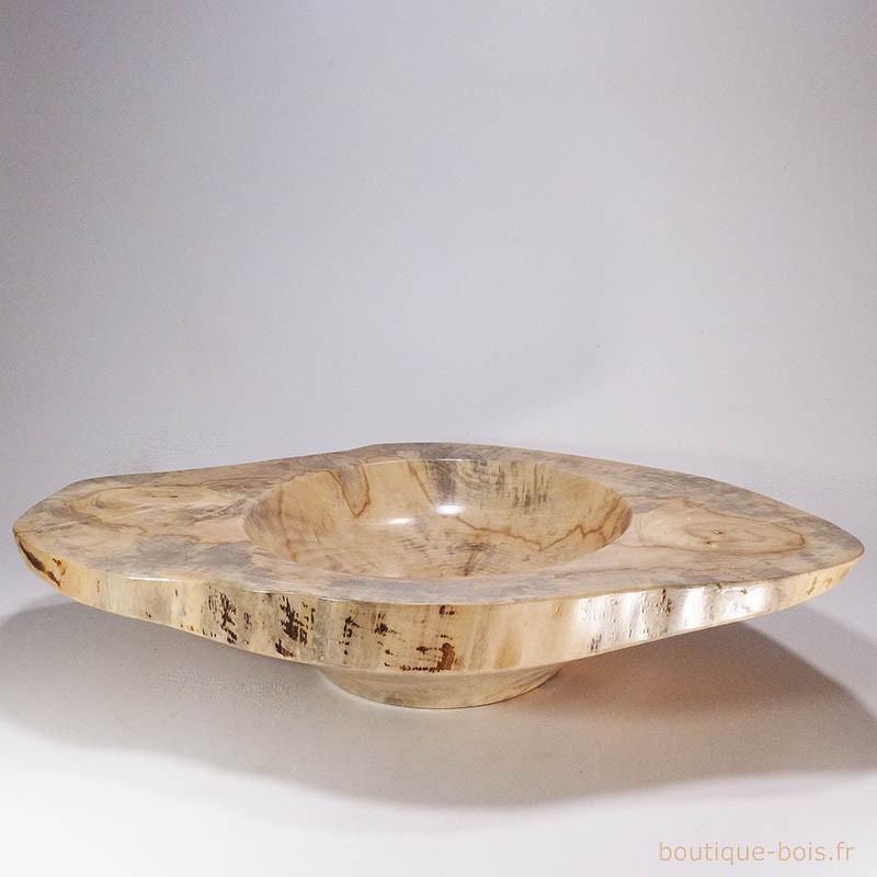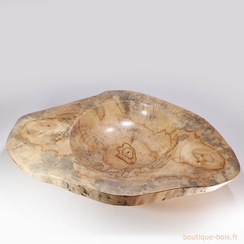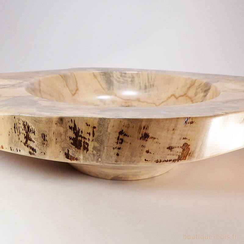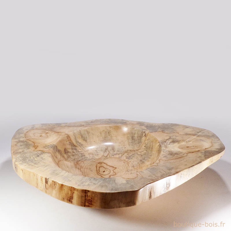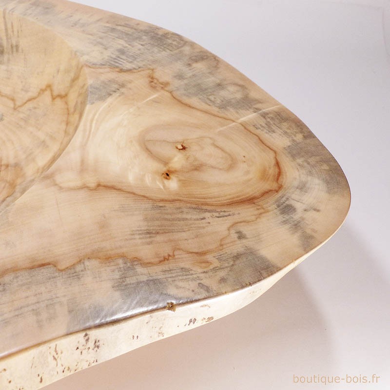 Voici une très belle grande coupe à fruits aux superbes dessins du bois de marronnier d'Inde avec l'esthétique du bois échauffé, ses lignes et ses encres apparues naturellement pendant le séchage qui le font ressembler à du marbre.