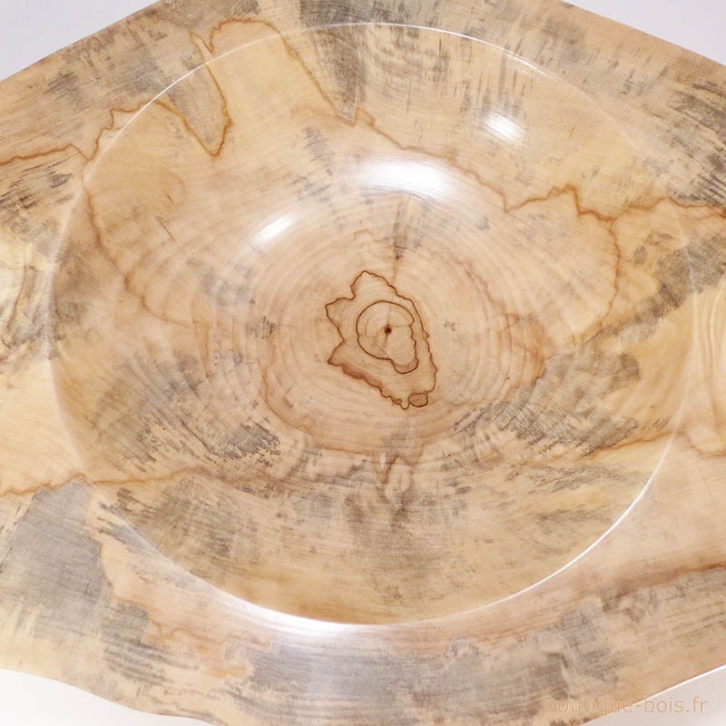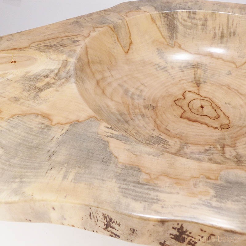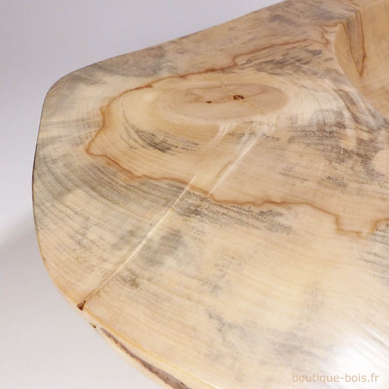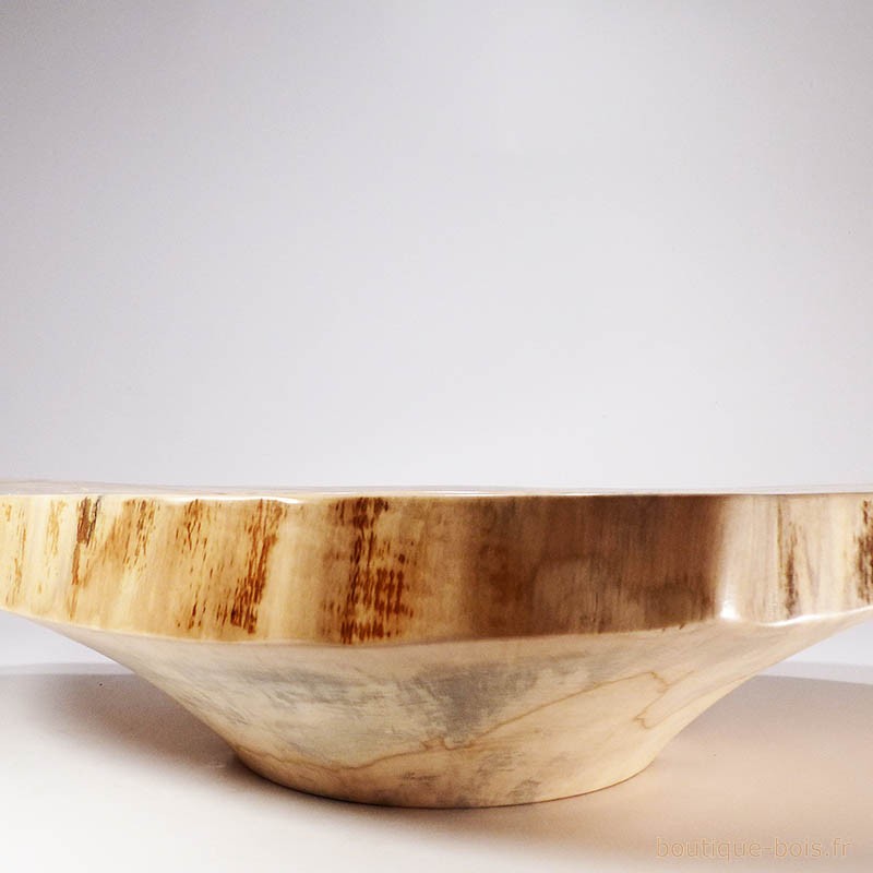 Le bois de cette coupe est protégé et ses dessins mis en valeur grâce à plusieurs couches d'un vernis satiné de grande qualité apte au contact avec les aliments.